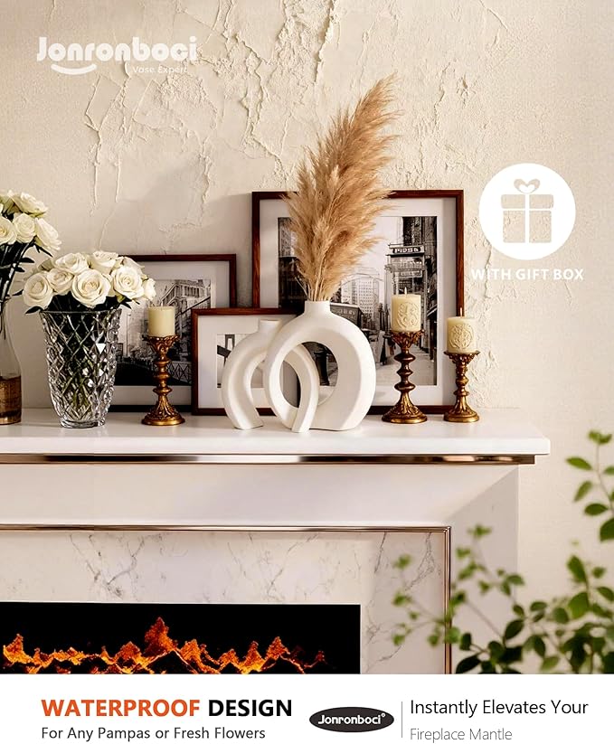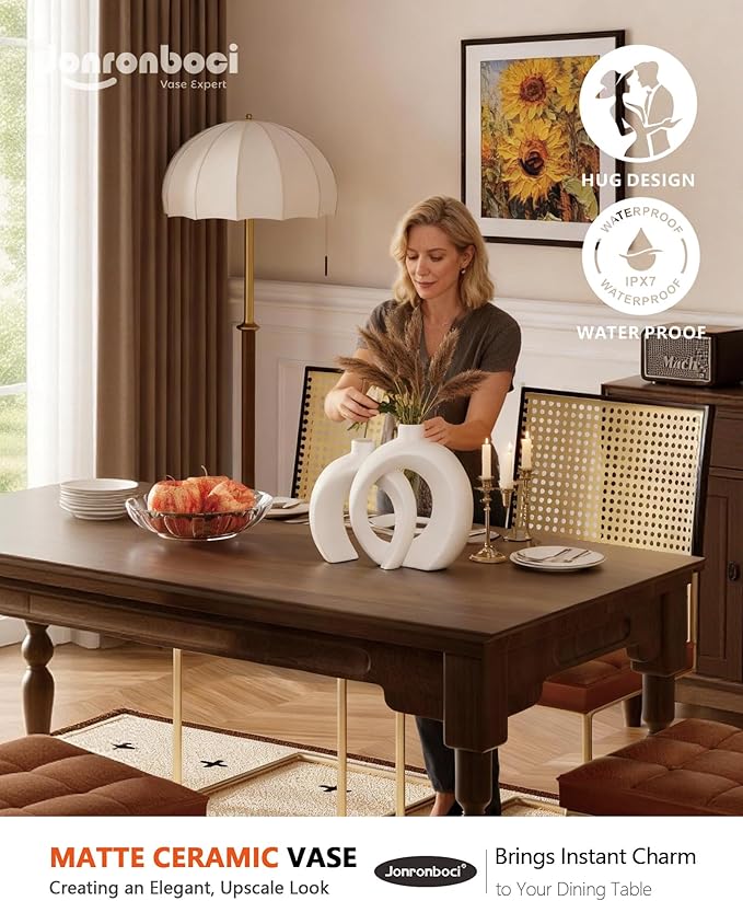 • đŸŒ· 【Unique Couple-Aesthetics Design – Modern and Romantic】This hollow donut vase set features a minimalist yet symbolic design — when placed together, the two vases resemble a couple in a warm embrace. Displayed separately, they become two elegant accents. A charming addition to blue decor, navy blue living room decor, or any modern space.