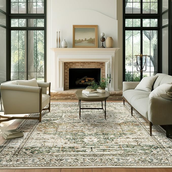 Washable Area Rug 8×10, Large Soft Rugs for Living Room Farmhouse Vintage Area Rugs for Bedroom Dining Room Non-Slip Stain Resistant Under Table Rug Olive Beige